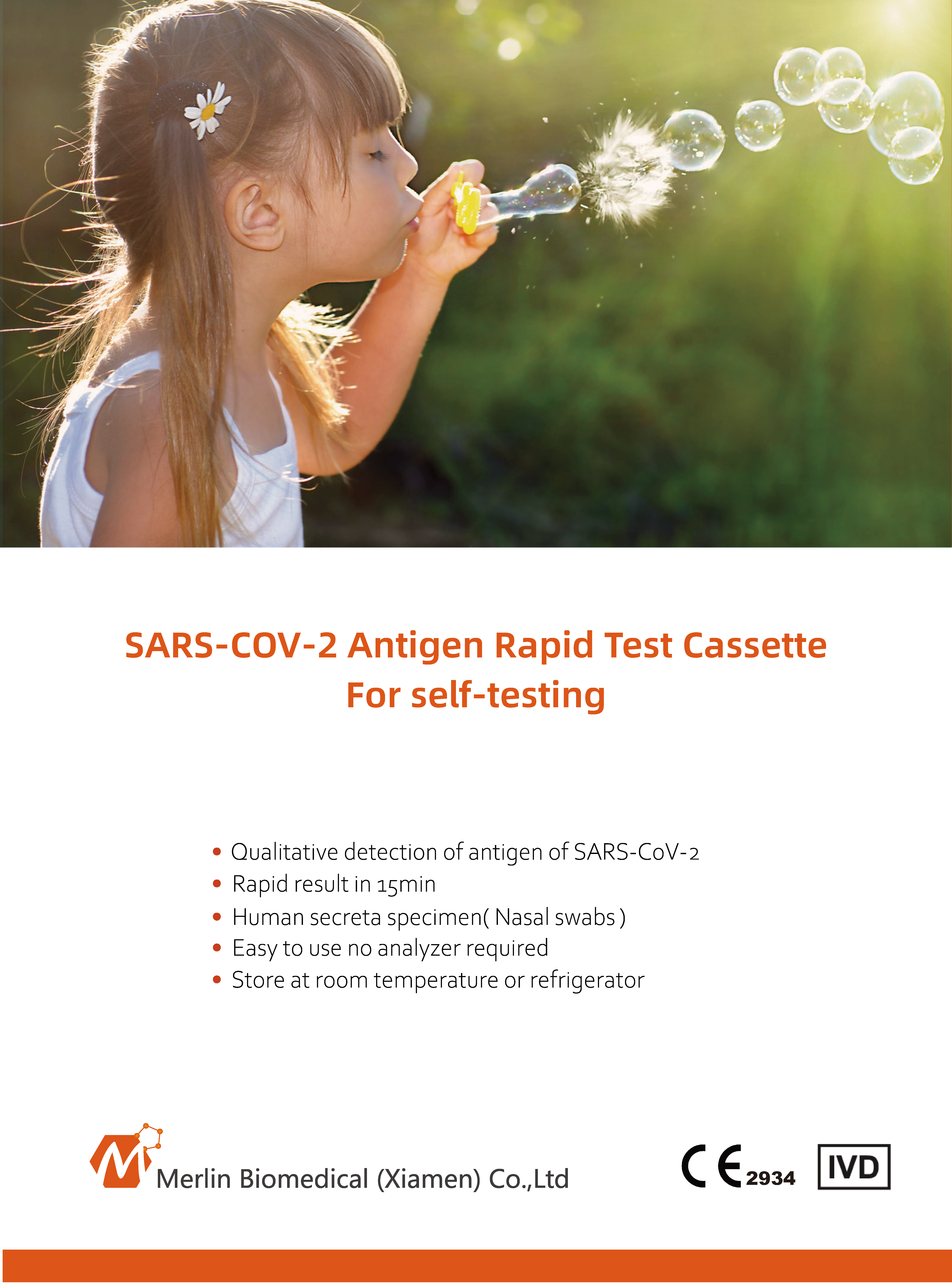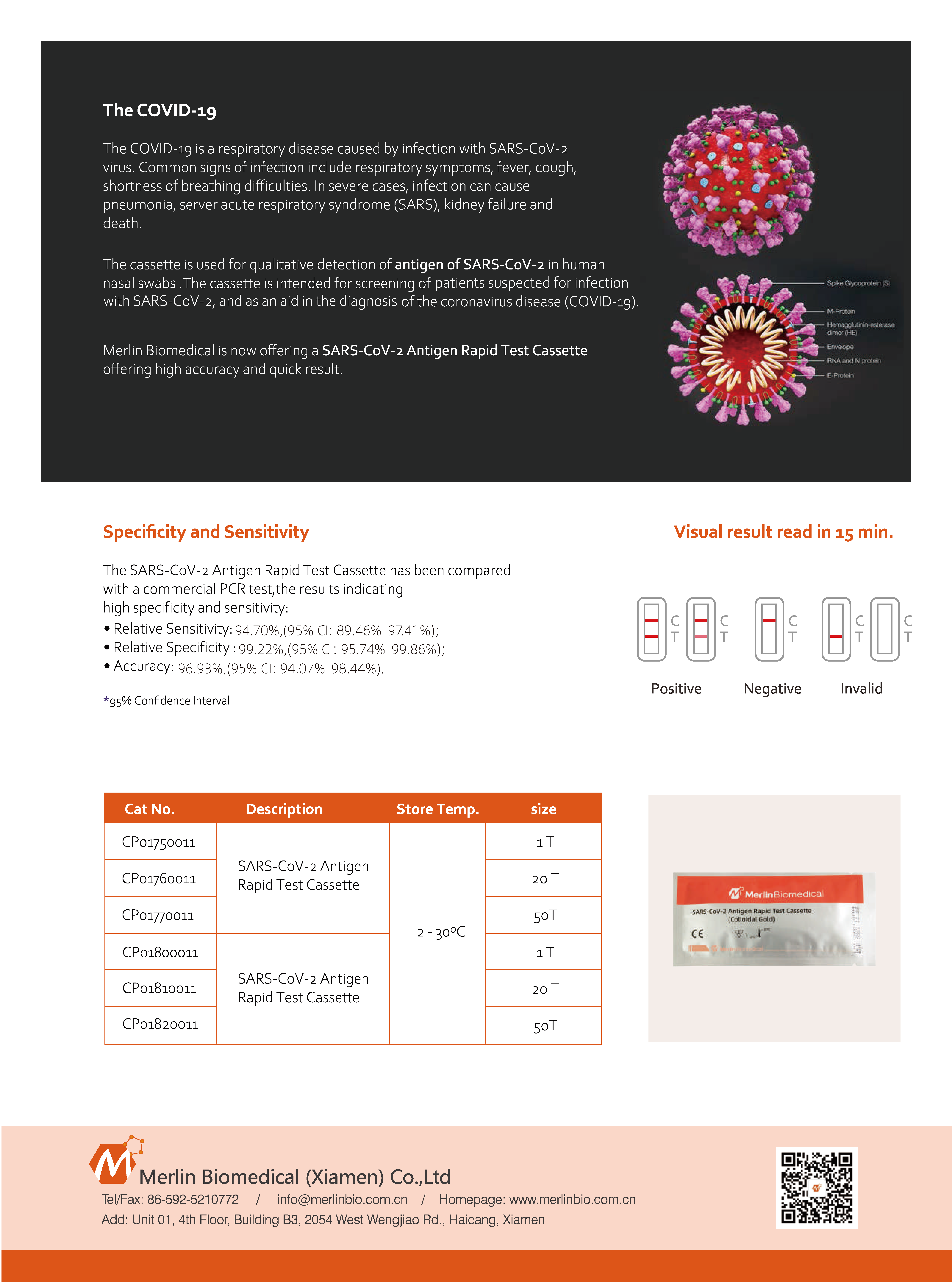 Qualitative detection of antigen of SARS-CoV-2<br />Rapid result in 15min<br />Easy to use no analyzer required<br />Store at room temperature or refrigerator